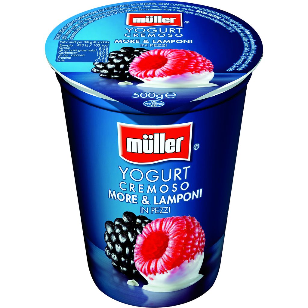 Yogurt cremoso alle more e lamponi in pezzi Yogurt cremoso con 23 % preparazione alla frutta (di cui frutta 54 %)